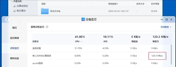 而在向极空间Z4Pro上传文件夹时,从设备服务进程监控中监测到上传瞬时速度达到120.3MB/s(受限于千兆网络速度)。如果你是在万兆网络环境中使用,是完全可以达到希捷酷狼Pro 24TB NAS硬盘的标称性能的。