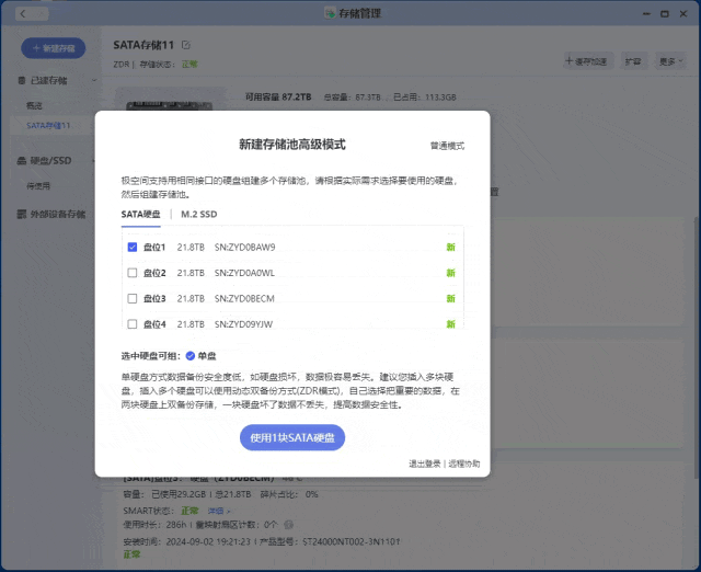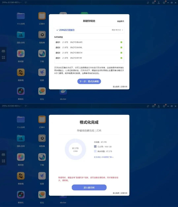 打开之后,可以根据推荐选择极空间自主创新的ZDR动态双备份模式,在硬盘完成格式化后看到实际可使用容量为87.3TB,笔者还真没用过这么大容量的NAS,着实有点小惊喜。现在就可以通过浏览器、手机App、电脑客户端、TV版和小程序多个客户端进行后续操作了。