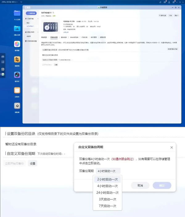 因为在NAS硬盘格式化时选择了ZDR动态双备份模式,我们可以设置需要双备份的内容、频率等,NAS就会自动定期进行备份,不仅仅保障重要数据的安全,更不会错过这些数据的内容同步更新。