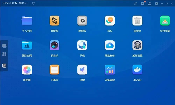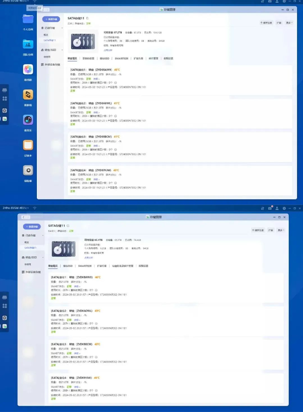 功能方面,极空间Z4Pro NAS提供了个人/团队空间、极相册、极影视、极音乐、记事本、保险箱、网盘备份、docker、虚拟机在内的一系列应用。在系统设置中,我们可以看到这4块希捷酷狼Pro 24TB NAS硬盘的概况,包括使用温度、可用容量等,就可以随时监控硬盘是否正常使用。
