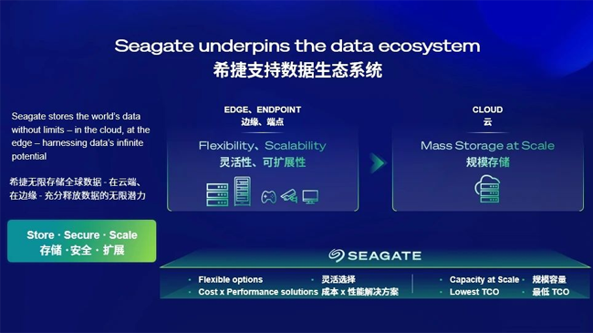 希捷致力于打造存储生态架构,我们提供灵活且可扩展的端点及边缘存储解决方案,以满足AI驱动的边缘存储需求。尽管云存储占据主流,但边缘存储因其即时响应和数据处理能力同样重要。希捷既能满足边缘存储的高灵活性和可扩展性要求,也能提供云存储所需的大规模容量,从而在AI存储市场中占据优势。全面发挥希捷行业领军地位,构建安全、可扩展的生态系统。
