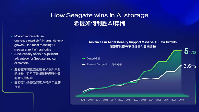 要在AI存储中致胜,希捷作为机械硬盘技术领导者,推出采用HAMR技术的魔彩盒(Mozaic)平台。HAMR技术,能大幅提升面密度,即每片盘片的数据承载量。希捷已能实现单盘片超过3TB的容量,未来还将达到5TB甚至更多。这使希捷能提供高性价比解决方案,同时与合作伙伴共同拉动市场发展,驱动AI数据增长,改变生活和工作方式。