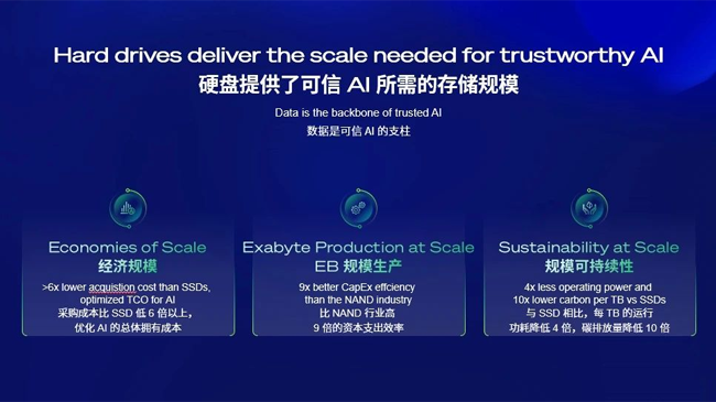 在AI发展过程中,硬盘扮演着至关重要的角色。在存储介质中,AI应用在不同阶段对存储介质需求不同,训练阶段多为DRAM和SSD,而创建和推理阶段大部分数据存储于HDD。数据中心90%的数据仍需存储在机械硬盘上。这一趋势在近期内不会改变。因为机械硬盘在数据规模、成本和能效方面具有显著优势。