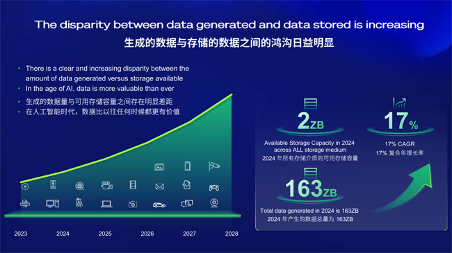 过去两年充满挑战,未来存储行业将发生翻天覆地的变化,这一变革由AI引发。2024年全球数据总量达163ZB,至2028年将跃升至394ZB,年复合增长率达24%,这一规模远超过去百年总和。