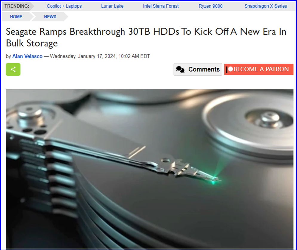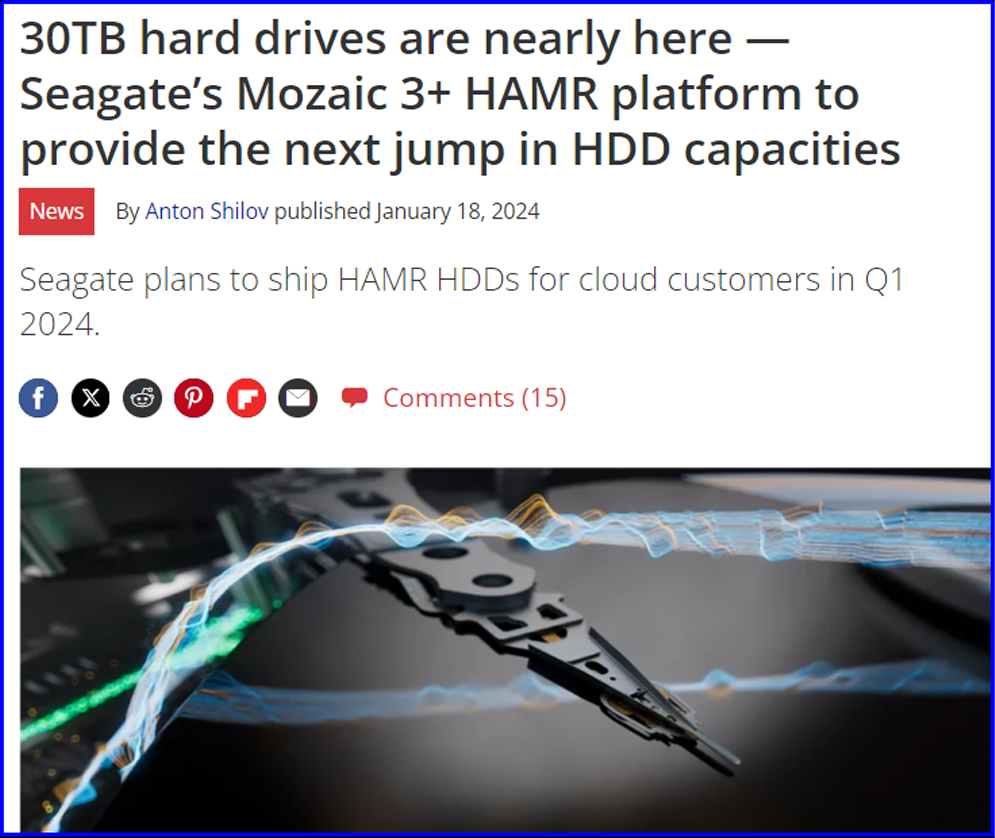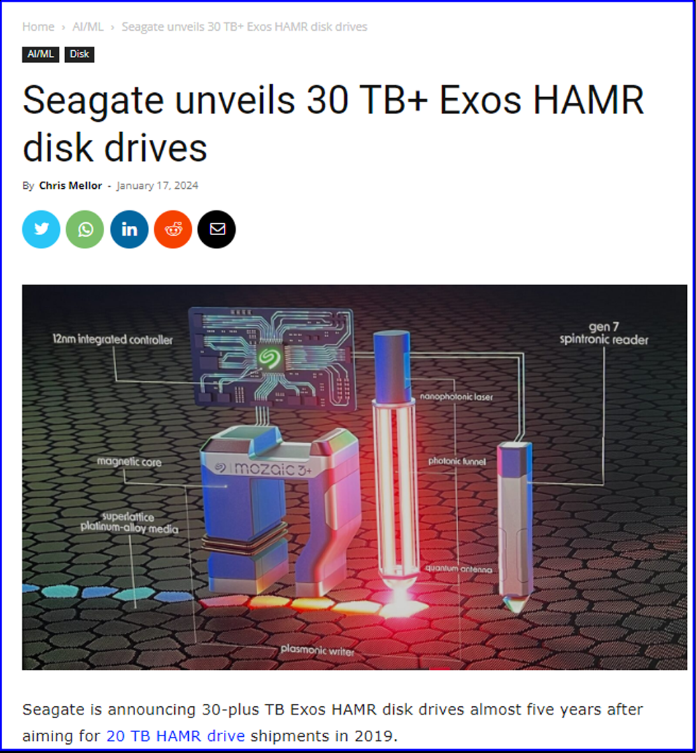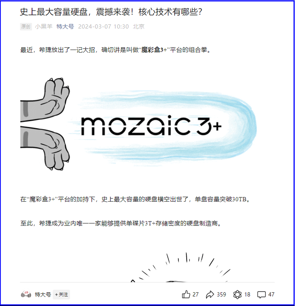 Blocks & Files:魔彩盒3+(Mozaic 3+)技术已实现大规模生产,希捷在容量竞赛中已明显领先。