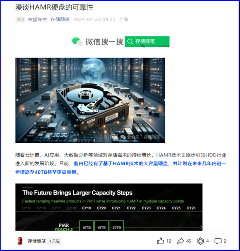 存储随笔:很显然,HAMR已经成为业内用于提升HDD硬盘容量硬盘的技术手段。包括希捷在内的多家硬盘厂商已经对HAMR硬盘进行了十多年的研究,但只有希捷大胆押注HAMR。