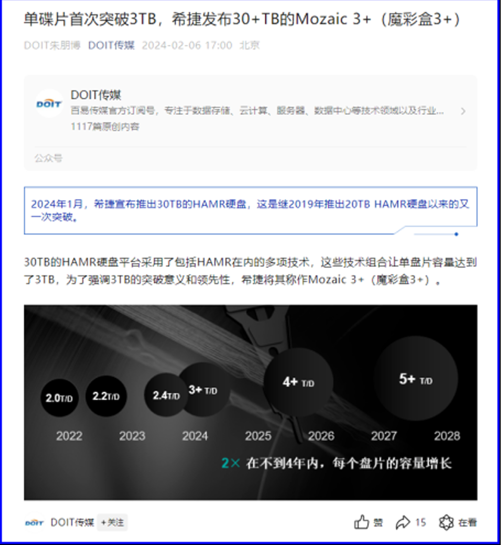 DOIT传媒:魔彩盒3+(Mozaic 3+)不仅带来的单盘大容量,还带来了更高的面密度增速和高容量增速,未来几年大概会以20%的增速快速增长,未来不可限量。