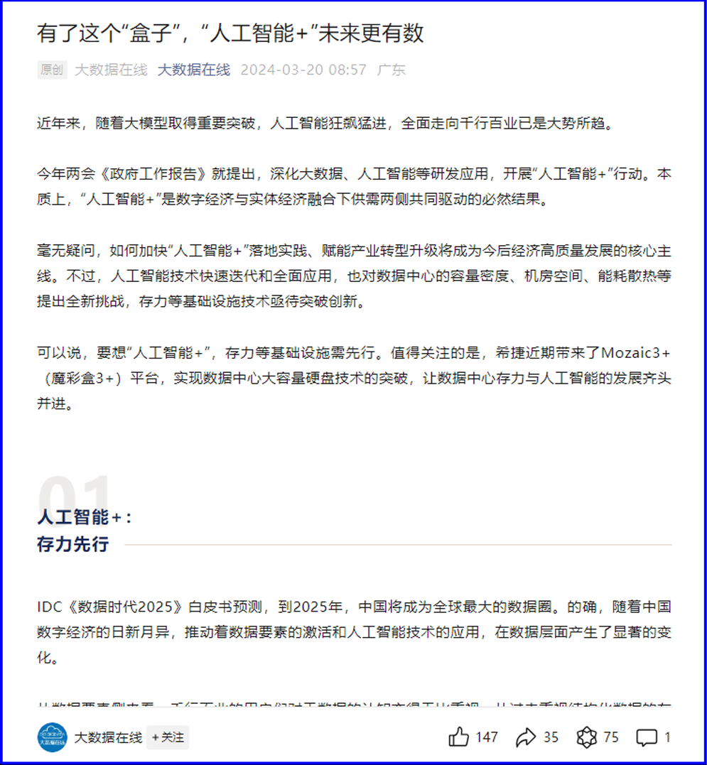 大数据在线:希捷Mozaic3+(魔彩盒3+)平台,实现数据中心大容量硬盘技术的突破,让数据中心存力与人工智能的发展齐头并进。