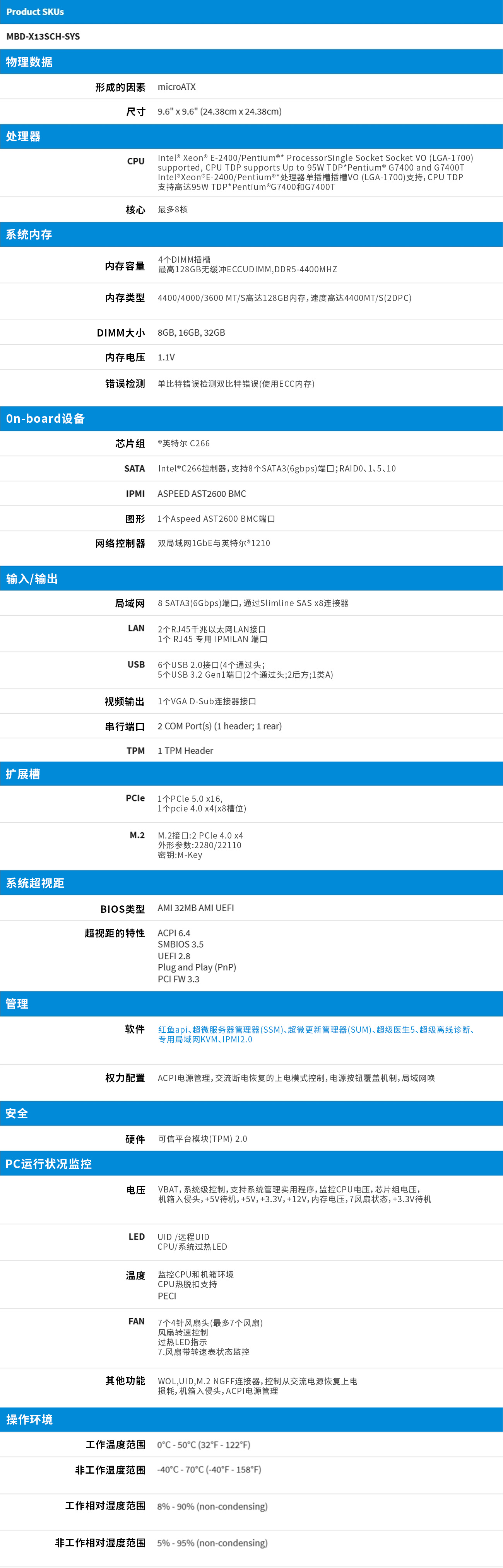 Intel至强E-2400系列处理器,奔腾处理器,单插座LGA-1700(插座Vo)CPUTDP最高支持95WTDPIntel®C266控制器,支持8个SATA3(6gbps)端囗;RAID 0、1、5、10最大128GB ECC无缓冲DIMM,DDR5-4400MHz,4个DIMM插槽1个PCle 5.0 x16,1个Pcle 4.0 x4 (in x8)1/0:1个VGA,2个COM,1个TPM头M.2接口:2个PCle 4.0 x4,M.2外形尺寸:2280、22110,M.2 Key: M-Key双局域网与英特尔®i210千兆以太网控制器5个USB 3.2 Gen1接囗(2个后置+1个Type A+2个通过头)6个USB 2.0接口(2个后置+4个通过头)