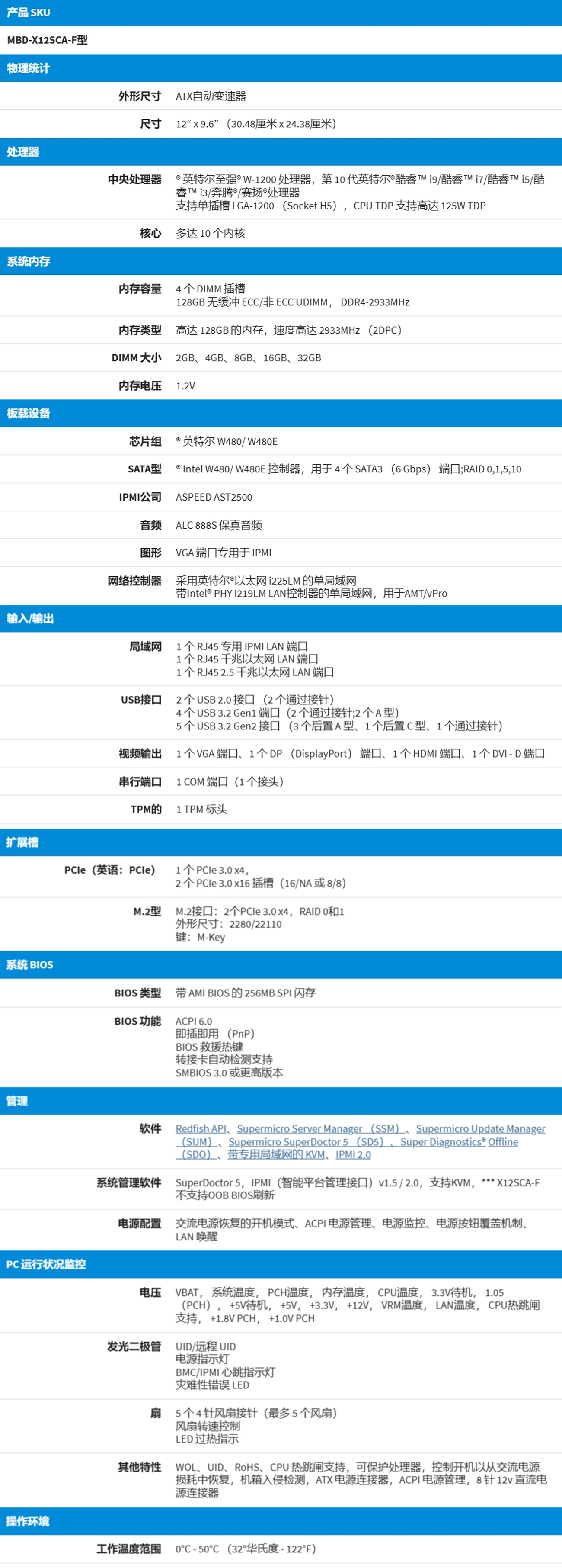 第 10 代英特尔®酷睿™ i9/酷睿™ i7/酷睿™ i5/酷睿™ i3/奔腾®处理器、英特尔®至强® W-1200 处理器支持单插槽 LGA-1200 (Socket H5),CPU TDP 支持高达 125W TDP带Intel® PHY I219LM LAN控制器的单局域网适用于 AMT/vPro采用英特尔®以太网 i225LM 的单局域网® 英特尔 W480/ W480E128GB 无缓冲 ECC/非 ECC UDIMM,DDR4-2933MHz,4 个 DIMM 插槽1 个 PCIe 3.0 x4,2 个 PCIe 3.0 x16 插槽(16/NA 或 8/8)1 - 5V PCI 32位M.2接口:2个PCIe 3.0 x4,RAID 0和1M.2 规格:2280/22110M.2 键:M-钥匙® Intel W480 控制器,用于 4 个 SATA3 (6 Gbps) 端口;RAID 0,1,5,101 个 DP (DisplayPort) 端口、1 个 HDMI 端口、1 个 DVI - D 端口、1 个 VGA 端口、VGA 端口专用于 IPMI