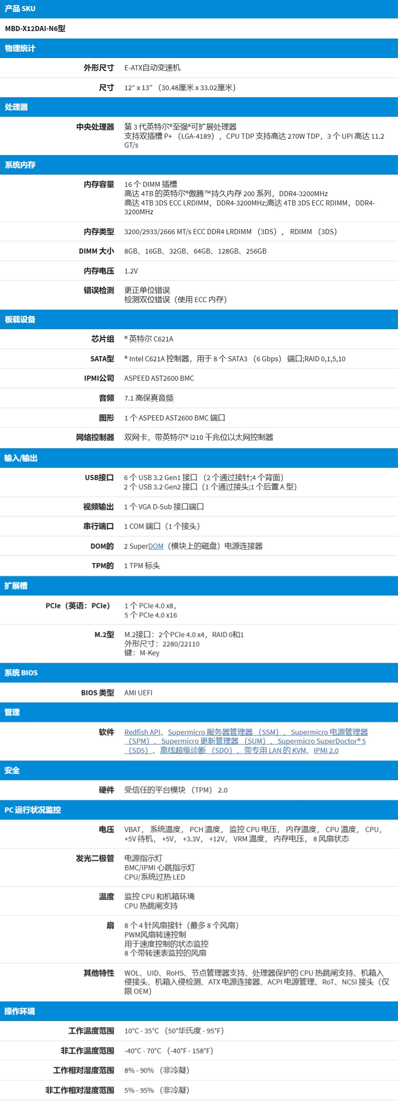 第 3 代英特尔®至强®可扩展处理器支持双插槽 LGA-4189 (Socket P+),CPU TDP 支持高达 270W TDP,3 个 UPI 高达 11.2 GT/s® 英特尔 C621A高达 4TB 3DS ECC RDIMM,DDR4-3200MHz;高达 4TB 3DS ECC LRDIMM,DDR4-3200MHz高达 4TB 的英特尔®傲腾™持久内存,DDR4-3200MHz,16 个 DIMM 插槽;5 个 PCIe 4.0 x16,1 个 PCIe 4.0 x8,4 PCIe 4.0 NVMe x4 内部端口M.2接口:2个PCIe 4.0 x4,RAID 0和1M.2 规格:2280/22110M.2 键:M-钥匙® Intel C621A 控制器,用于 8 个 SATA3 (6 Gbps) 端口;RAID 0,1,5,10双网卡,带英特尔® i210 千兆位以太网控制器1 个 VGA D-Sub 连接器端口