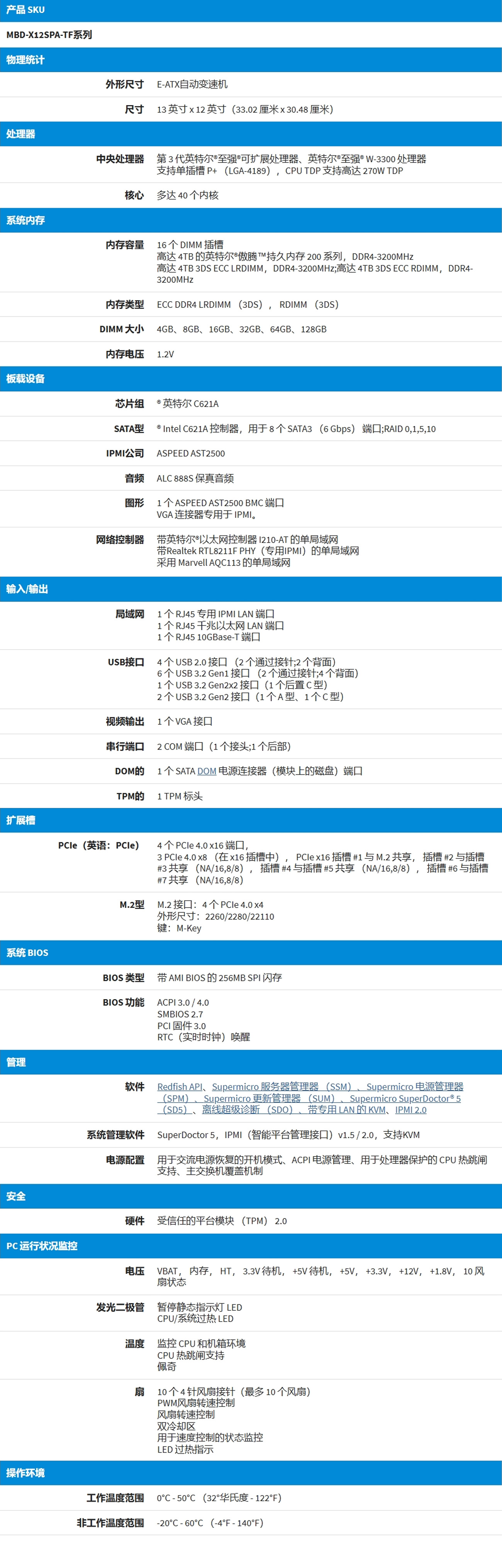 第 3 代英特尔®至强®可扩展处理器、英特尔®至强® W-3300 处理器支持单插槽 LGA-4189 (Socket P+),CPU TDP 支持高达 270W TDP® 英特尔 C621A带英特尔®以太网控制器 I210-AT 的单局域网,采用 Marvell AQC113 的单局域网,带Realtek RTL8211F PHY(专用IPMI)的单局域网高达 4TB 3DS ECC RDIMM,DDR4-3200MHz;高达 4TB 3DS ECC LRDIMM,DDR4-3200MHz高达 4TB 的英特尔®傲腾™持久内存,DDR4-3200MHz,16 个 DIMM 插槽4 个 PCIe 4.0 x16 端口,3 PCIe 4.0 x8 (插槽 x16)M.2 接口:4 个 PCIe 4.0 x4M.2 规格:2260/2280/22110M.2 键:M-钥匙RAID 需要对 RAID 0、1、5、10、VROC 密钥的 M.2 支持。® Intel C621A 控制器,用于 8 个 SATA3 (6 Gbps) 端口;RAID 0,1,5,101 个 VGA 端口,VGA 连接器专用于 IPMI。