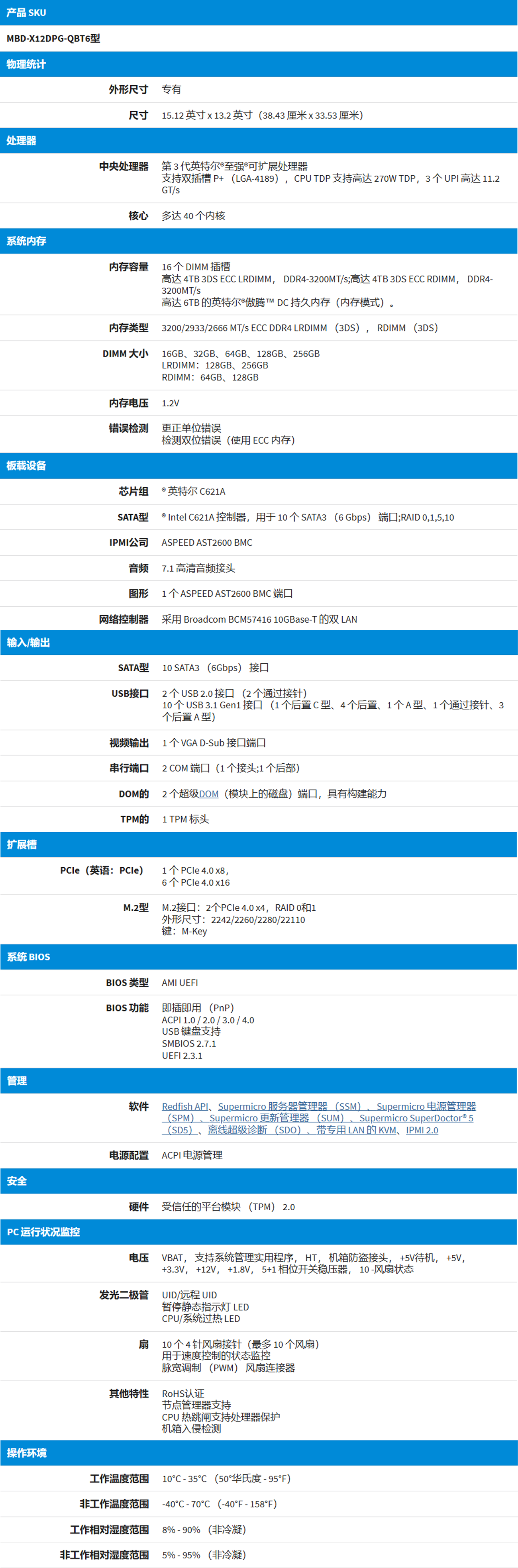 ® 英特尔节点管理器、IPMI2.0、带专用 LAN 的 KVM、NMI、SPM、SSM、SUM、SuperDoctor® 5