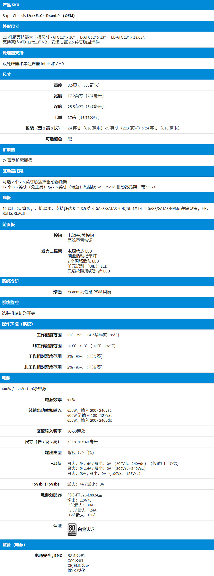 600W / 650W 1U冗余电源