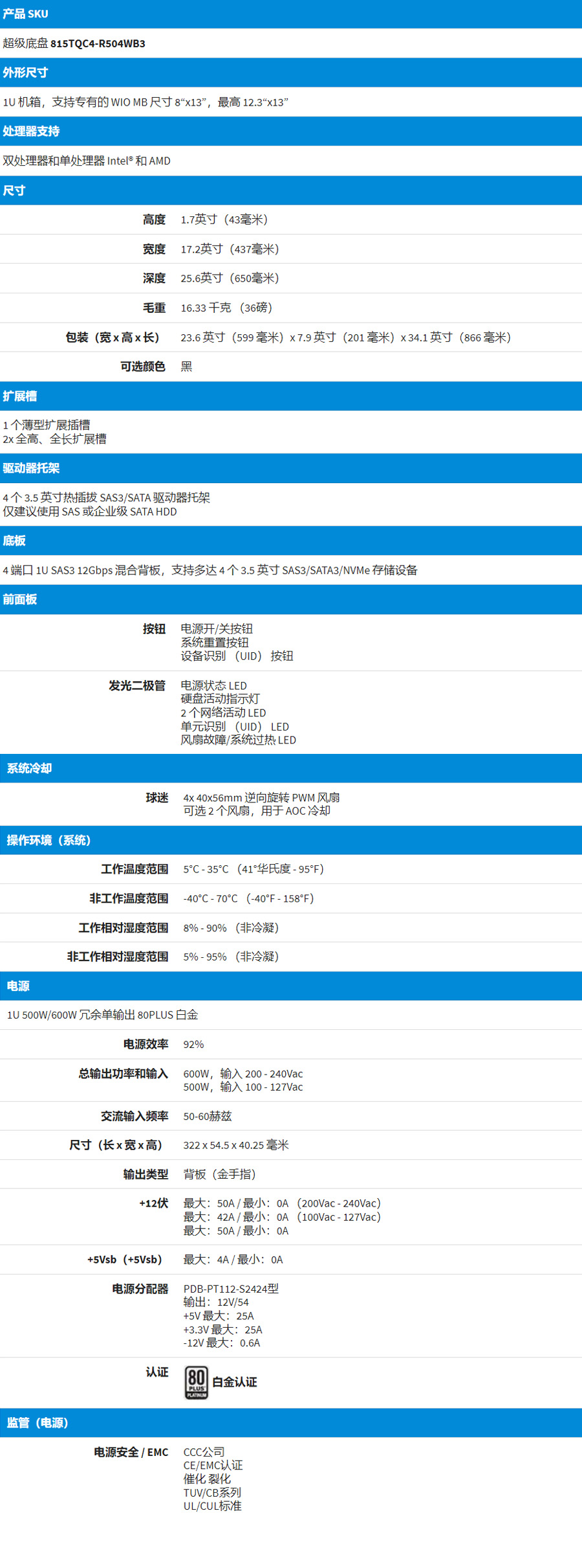 1U 500W/600W 冗余单输出 80PLUS 白金