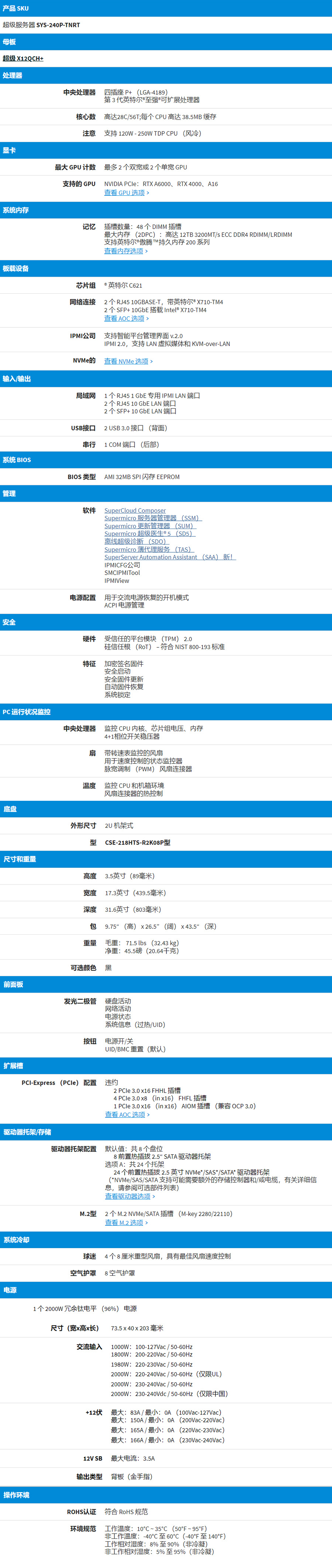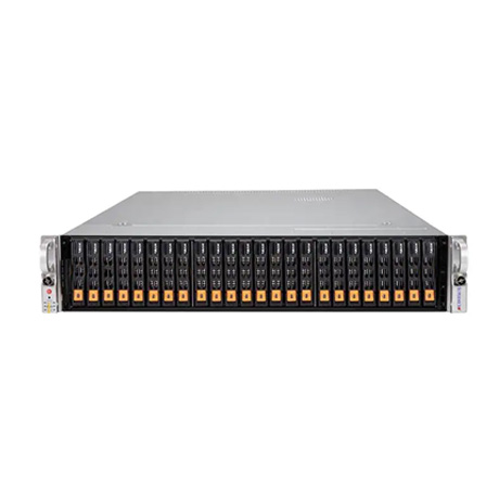 多达 24 个热插拔 2.5 英寸 NVMe/SAS3/SATA3 驱动器托架(默认为 8 个 SAS3/SATA3 驱动器托架);板载 2 个 M.2 SATA。