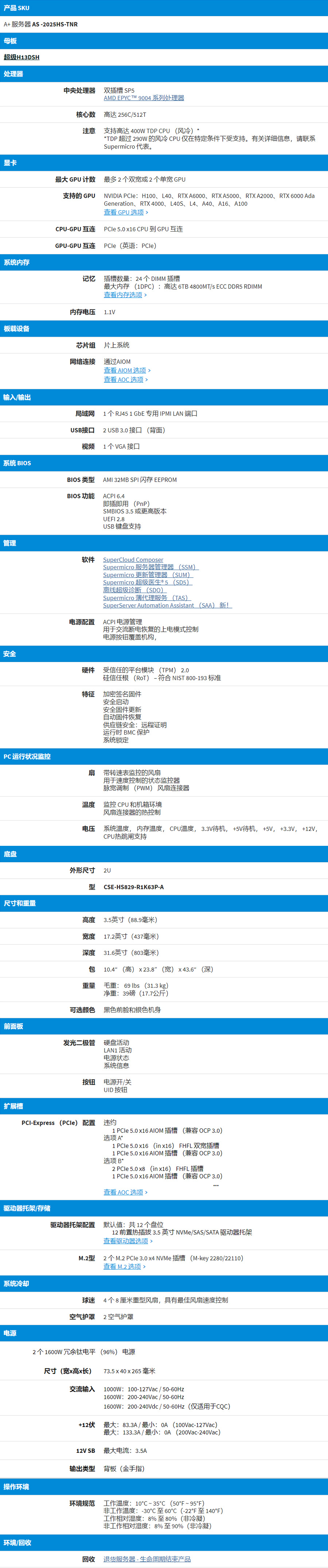 1 个 AIOM/OCP NIC 3.0 插槽,最多配置选项;4 个 PCIe 5.0 x16 插槽或;8 个 PCIe 5.0 x8 插槽或;3 个 PCIe 5.0 x16 插槽 + 2 个 PCIe 5.0 x8 插槽或;2 个 PCIe 5.0 x16 插槽 + 4 个 PCIe 5.0 x8 插槽或;1 个 PCIe 5.0 x16 插槽 + 6 个 PCIe 5.0 x8 插槽。