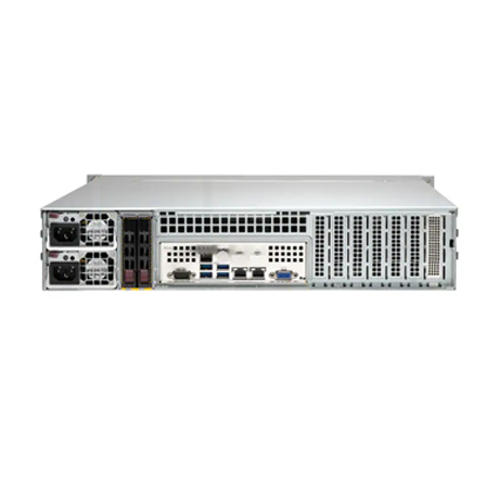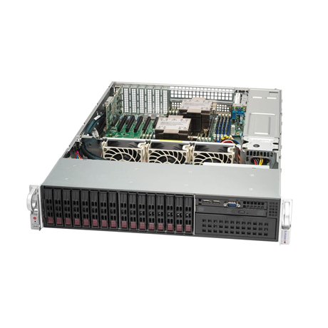16 个热插拔 2.5 英寸硬盘托架,支持 8 个 SAS RAID(0、1、5、6、10、50、60)和 8 个 SATA 硬盘。