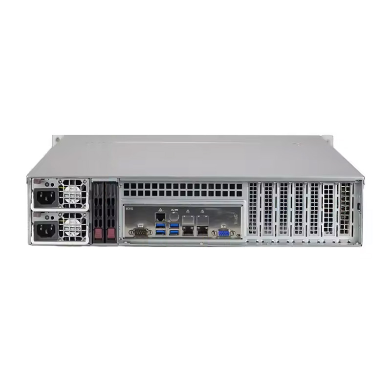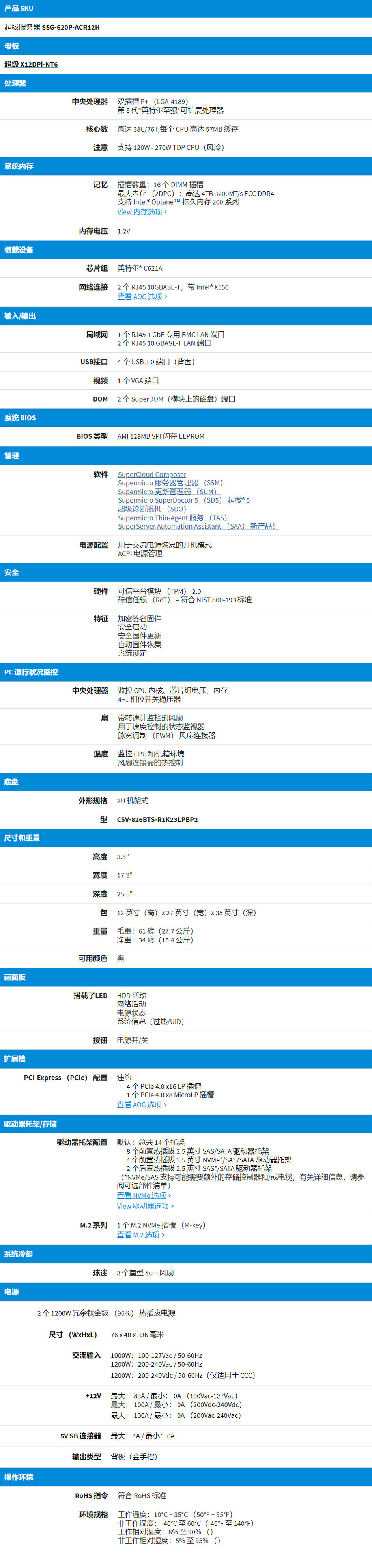 12 个 3.5 英寸热插拔混合 SATA/SAS 驱动器托架(4 个 NVMe Hyprid 端口);2 个后 SATA 2.5 英寸插槽;板载 1 个 M.2 NVMe。