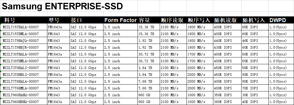 三星PM1643 SAS SSD是PM1633a的升级版,采用三星最新64层TLC V-NAND,搭配三星SAS3.0控制器,SAS 12Gbps接口,2.5 inch规格形态,960GB、1.92TB、3.84TB、7.68TB、15.36TB、30.72TB六种容量选择。